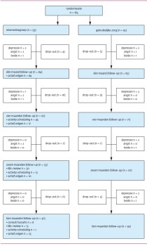 In een pragmatische gerandomiseerde gecontroleerde trial vergeleken we de effecten van het programma met gebruikelijke zorg in veertien verzorgingshuizen. In totaal deden 185 bewoners mee, die op de Centre for Epidemiologic Studies Depression Scale (CES-D) minstens 8 punten scoorden, niet leden aan een depressieve of angststoornis en ook niet aan een ernstige cognitieve stoornis. De deelnemers kregen een stepped-care preventieprogramma (n = 93) of gebruikelijke behandeling (n = 92). De deelnemers aan het preventieprogramma kregen eerst een afwachtend beleid en als ze niet opknapten achtereenvolgens een zelfhulpinterventie, een psychologische life-review en een verwijzing naar de huisarts. Onze primaire uitkomstmaat was de incidentie van een depressieve stoornis of angststoornis gedurende het jaar na inclusie.