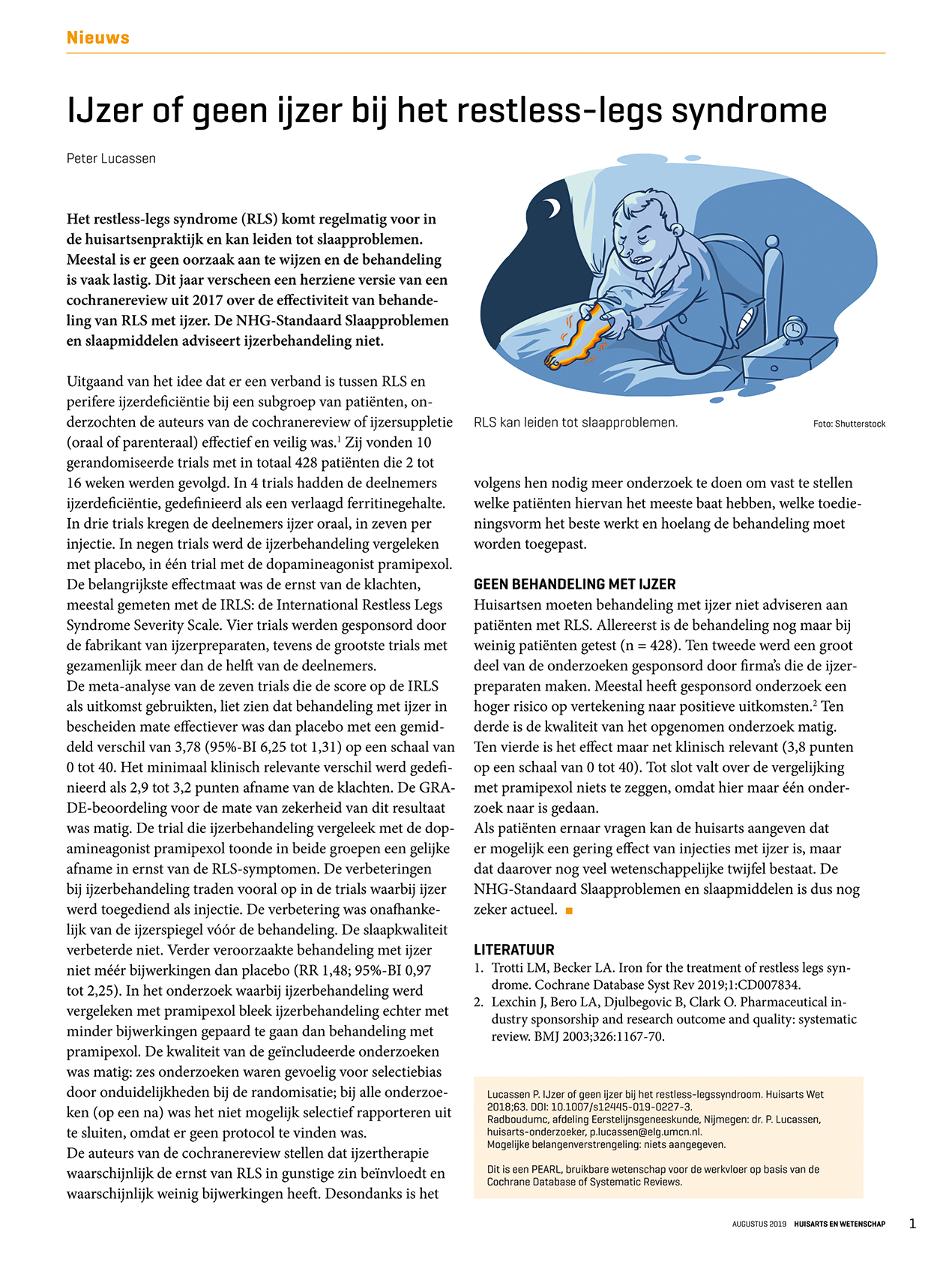 Lokroep in mailing: ‘De NHG-Standaard adviseert ijzertekort niet te behandelen’. In het nieuwsbericht van 19 augustus 2019 staat: ‘De auteurs van de cochranereview stellen dat ijzertherapie waarschijnlijk de ernst van Restless Legs Syndrome (RLS) in gunstige zin beïnvloedt en waarschijnlijk weinig bijwerkingen heeft.’ Voor deze Nederlandse afweging wordt alleen de cochranereview gebruikt, met als toevoeging een artikel dat onderbouwt dat gesponsord onderzoek vaak te rooskleurig is. Vervolgens verandert de conclusie sterk. Het is een klassiek Nederlandse zéér behoudende manier van geneeskunde bedrijven. Soms goed, soms niet.
