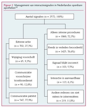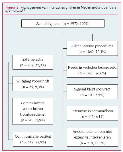 Een specifiek farmacotherapiegerelateerd probleem is de interactie tussen geneesmiddelen. Het is aangetoond dat deze interactie kan leiden tot geneesmiddelgerelateerde morbiditeit, inclusief onnodige ziekenhuisopnamen.1314 We onderzochten de omvang en de aard van interactiesignalen in de openbare apotheek en de manier waarop apotheken die afhandelden.15 In 63 apotheken verzamelde men hierover gegevens, gedurende gemiddeld 2,4 dagen per apotheek (totaal 153 dagen). De apotheken legden ook variabelen vast die te maken hadden met de signalen (betrokken geneesmiddelen, signaal voor het eerst of niet, zelfde of verschillende voorschrijvers), de patiënt (leeftijd, geslacht), en de afhandeling (uitsluitend interne procedure of ook externe actie, zoals communicatie met de patiënt, met de voorschrijver/trombosedienst of wijziging recept). We classificeerden de interacties naar relevantie (categorie A tot F) en bewijs (categorie 0 tot 4) conform het classificatiesysteem van het WINAp.16 Gemiddeld zagen de apotheken bijna 17 interactiesignalen per dag, dus bij ongeveer 6% van de (WMG) voorschriften. De 2572 interactiesignalen kwamen voor bij 1891 patiënten, gemiddeld 1,4 per patiënt (spreiding 1-12). Bij 31,1% ging het om een eerste melding. De 20 meest voorkomende geneesmiddelinteracties zorgden voor bijna 76% van de signalen (alle interactiesignalen die in dit onderzoek zijn gevonden staan met hun frequentie op www.stevenshof.nl). Hart- en vaatmiddelen, NSAID’s, orale anticonceptiva en antibiotica waren het meest betrokken, wat overeenkomt met andere onderzoeken.17 Het merendeel van de interacties is redelijk evidence-based (categorie 3) en veroorzaakt mogelijk matig tot ernstige klachten (categorie C en D). Interacties met mogelijk ernstige klinische gevolgen (categorieën E en F) kwamen minder frequent voor: n = 292 (van 2572), oftewel 0,7% van alle (uitsluitend recept)voorschriften (n = 43.129). Figuur 2 laat zien hoe apotheken deze signalen afhandelden. We onderscheiden externe acties (receptwijziging of overleg met de voorschrijver of patiënt) van interne procedures (waarbij de apotheek intern onderzoekt of ingrijpen nodig is). Externe acties kwamen het minst voor, namelijk in 27,3% van de gevallen. De belangrijkste externe actie was communicatie met de patiënt. De apotheek adviseerde de patiënt bijvoorbeeld om middelen met een interval van 2 uur in te nemen (19%), om de bloeddruk regelmatig te laten controleren (16%) of om te zorgen voor aanvullende anticonceptie (10%). We zagen ook waarschuwingen voor mogelijke maagproblemen (3%) of verstoring van de menstruele cyclus (3%). Ook adviezen om contact te zoeken met de arts over de invloed van de interactie op de kaliumspiegel (3%) of de trombosedienst te waarschuwen (9%) kwamen regelmatig voor. We denken dat niet alle patiënten goed kunnen omgaan met deze laatste soort informatie.18 Het lijkt beter als de apotheker rechtstreeks contact opneemt met de voorschrijvende arts danwel de trombosedienst. We moeten echter constateren dat apothekers relatief beperkt contact hebben met de voorschrijver bij de afhandeling van interacties, zoals figuur 2 laat zien. Bovendien vindt een belangrijk deel van de communicatie plaats met de trombosedienst. De interne procedures leidden meestal niet tot externe actie; vaak omdat er in het verleden al een evaluatie bleek te zijn geweest (1425 van 1860; 76%). Overigens volgde op ongeveer 14% van de herhaalde signalen wel een externe actie. We kunnen dit gedeeltelijk verklaren uit het feit dat informatie maanden of zelfs jaren geleden was gegeven. Verminderde effectiviteit van de anticonceptiepil door een interactie is een goed voorbeeld daarvan. Bij 13 van de 15 van dergelijke signalen vonden we herhaalde externe actie. Anderzijds werd slechts 56% van de eerste signalen gevolgd door externe actie. Een deel van de redenen vindt u terug in figuur 2. Dat een interactie voor het eerst voorkomt was overigens wel veruit de belangrijkste determinant om tot externe actie over te gaan (OR 7,5; 95%-BI 6,1-9,2). Het grote aantal signalen dat uiteindelijk niet tot externe actie leidt, is een punt van zorg. Het is bekend dat te veel signalen, zeker van deze signatuur, leidt tot ’door enteren’.19 Het is belangrijk hier verder onderzoek naar te doen.
