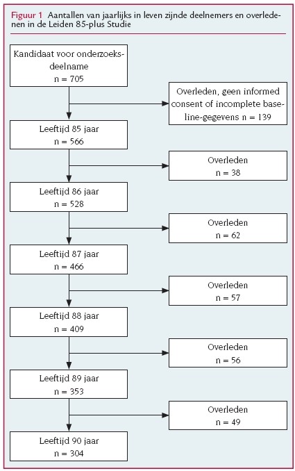 De Leiden 85-plus Studie is een observationeel, prospectief onderzoek onder de algemene populatie van inwoners uit de stad Leiden. Tussen september 1997 en september 1999 hebben 705 in Leiden woonachtige personen de leeftijd van 85 jaar bereikt, waarmee ze kandidaat werden voor deelname aan het onderzoek. Er waren geen selectiecriteria met betrekking tot gezondheid of demografische eigenschappen. We includeerden 599 (85%) personen, die allen informed consent gaven. We bezochten de deelnemers jaarlijks thuis voor face-to-face interviews, bloedafname en een ECG. De Medisch Ethische Commissie van het Leids Universitair Medisch Centrum keurde het onderzoek goed.