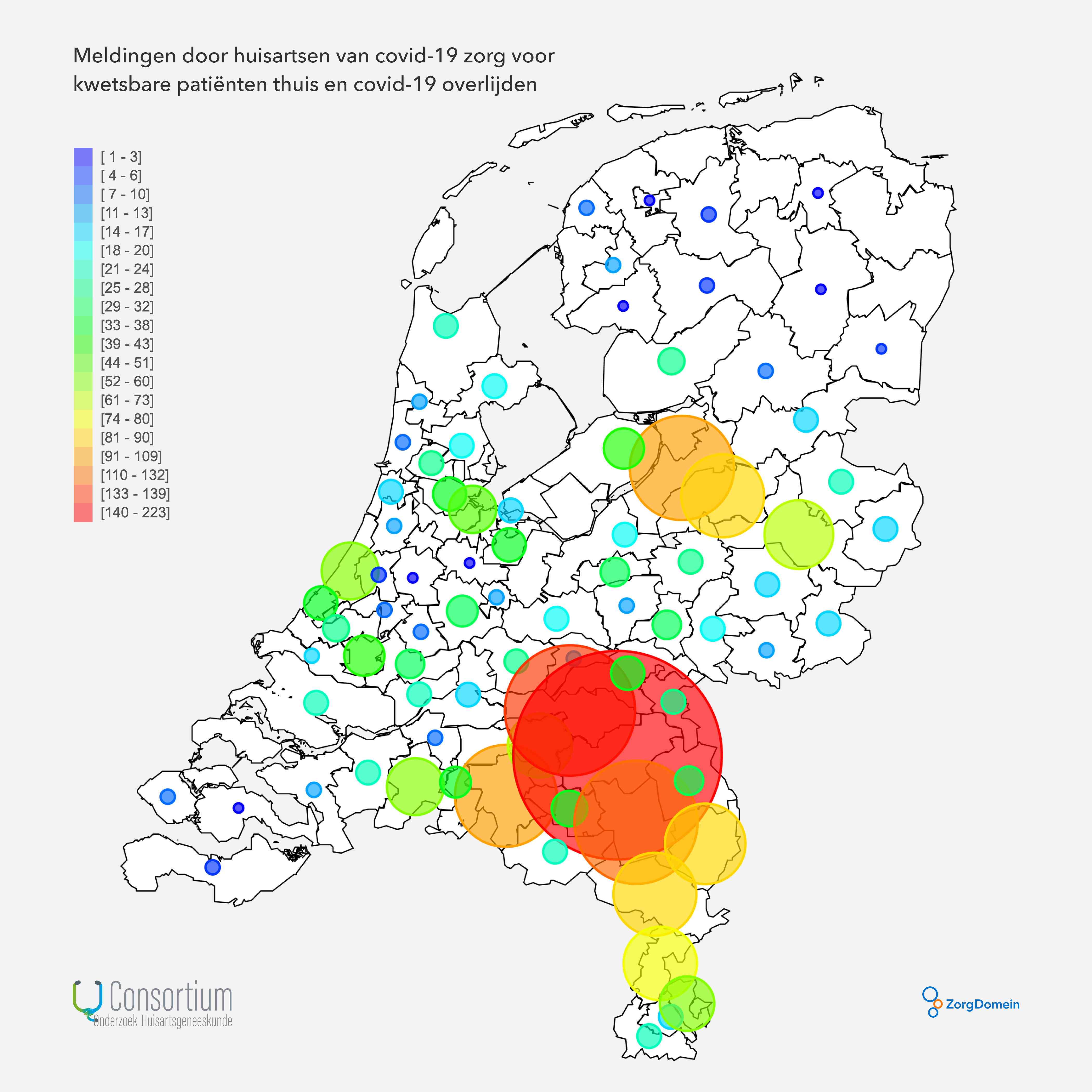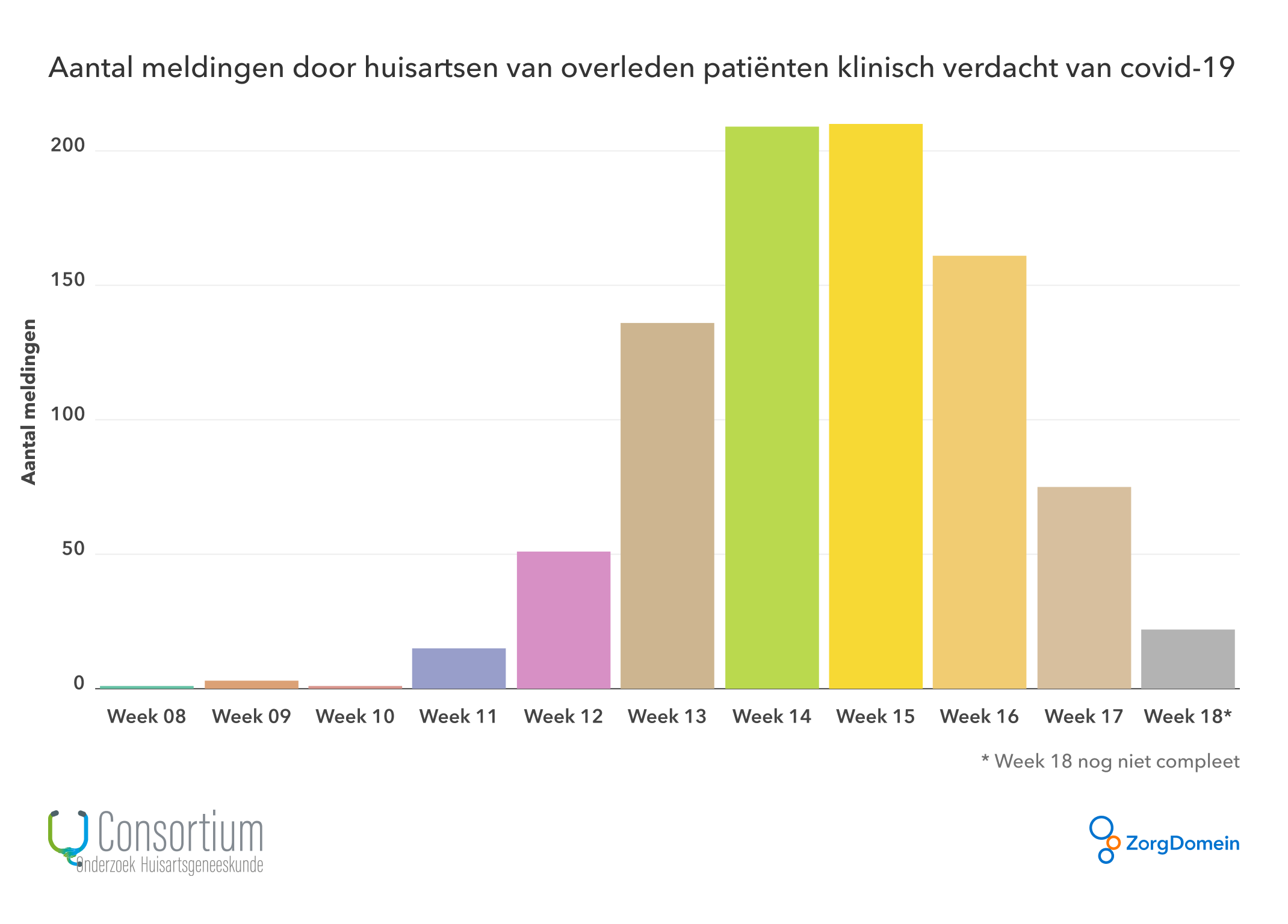 Huisartsen hebben via de meldknop in ZorgDomein in totaal 2.570 patiënten gemeld die zijn overleden door COVID-19, of thuis intensieve zorg hebben gekregen. Dit betreft zowel patiënten met een PCR-bevestigde COVID-19-infectie als patiënten met een klinisch beeld sterk verdacht voor COVID-19.