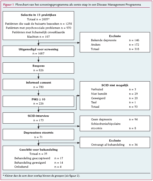 Huisartsen ontvingen een lijst van patiënten die het onderzoeksteam had geselecteerd. Zij excludeerden vervolgens de patiënten die zij al eerder hadden herkend als patiënten met een DS, schizofrenie, een psychose of een bipolaire stoornis. Ook excludeerden de huisartsen patiënten die om andere redenen niet geschikt waren om deel te nemen: vanwege somatische klachten (bijvoorbeeld blindheid, terminale ziekte), mentale retardatie of door problemen met de Nederlandse of Engelse taal. Vervolgens stuurde de huisarts een brief naar de geïncludeerde patiënten, waarin deze het onderzoek toelichtte en de patiënten om deelname verzocht. Daarnaast kregen de patiënten een informed consent-formulier en het screeningsinstrument, de Nederlandse versie van de Patient Health Questionnaire (PHQ)15. Patiënten die niet binnen twee weken reageerden kregen een herinnering. Aan de hand van de ontvangen PHQ’s selecteerden we patiënten met een positieve screeningsscore voor een DS (PHQ-9 score ≥ 10). Bij deze patiënten namen we een diagnostisch interview af (SCID-I)16. We stuurden de resultaten van dit interview naar de huisarts en de patiënt. Patiënten die op basis van het SCID-I-interview de diagnose DS kregen, adviseerden we om de interviewresultaten en behandelingsopties met hun huisarts te bespreken. Als patiënten geen contact opnamen met hun huisarts, belden we ze twee weken later op en vroegen we hen naar de redenen daarvoor. We adviseerden hen alsnog contact met hun huisarts op te nemen.
