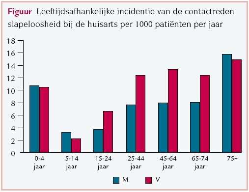 Slechts 10-20% van de mensen die slaapproblemen hebben, komt hiervoor bij de huisarts.12 Slecht slapen komt het meest voor bij baby's en kleine kinderen. Na de puberteit neemt de incidentie weer toe met de leeftijd ( figuur).78 Deze cijfers betreffen met name de klacht slapeloosheid; van de andere slaapklachten zoals hypersomnie, circadiane slaapklachten en parasomnie zijn geen gegevens bekend.
