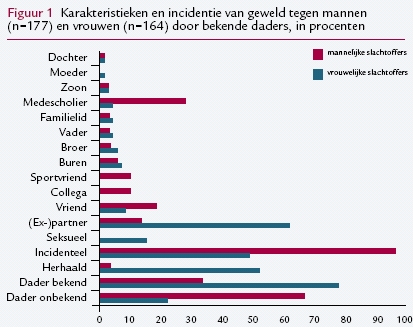 Van 1996-1999 hebben de CMR-peilstations het vóórkomen van ’fysiek geweld’ geregistreerd. Daaruit blijkt dat de daders van fysiek geweld in overgrote meerderheid mannen zijn (95%). Geweld tegen mannen wordt meestal gepleegd door onbekenden (67%), bij geweld tegen vrouwen daarentegen is de dader meestal een bekende van het slachtoffer (78%). Vaak is dit de (ex-)partner (61%) of een familielid (17%) (figuur1). Bij ruim de helft van de vrouwelijke slachtoffers gaat het om herhaald fysiek geweld dat jaren kan voortduren, bij 15% is er tevens sprake van seksueel geweld. De gemiddelde leeftijd van de vrouwen was 32 jaar (5-63 jaar), van de mannen 24 jaar (11-57 jaar).