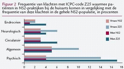 Om meer inzicht te krijgen in de kenmerken van de patiënten die naar de huisarts gaan als slachtoffer van geweld, hebben wij gegevens geanalyseerd van de Tweede Nationale Studie naar ziekten en verrichtingen in de huisartspraktijk (NS2). We keken naar patiënten met de ICPC-code Z25 (problemen met betrekking tot geweld) in hun ziektegeschiedenis. De incidentie van Z25 in de praktijken die aan NS2 deelnemen, is gelijk aan de incidentie van fysiek geweld die de praktijken van de peilstations registreren: 6 per 10.000. Uit gegevens van NS2 blijkt dat deze patiënten aanmerkelijk vaker dan gemiddeld de huisarts consulteren voor andere problemen dan geweld. Mannen die hulp inroepen bij geweldsproblemen blijken gemiddeld 6,7 keer per jaar contact te hebben met hun huisarts (gemiddelde van alle mannen: 2,5), vrouwen maar liefst 10,6 keer (gemiddelde van alle vrouwen: 3,9). Ze behoren daarmee tot de groep van de bekende grootgebruikers die ongeveer 5% van de patiëntenpopulatie uitmaakt. De belangrijkste andere problemen waarvoor deze patiënten hun huisarts vaker dan gemiddeld bezochten, staan in figuur 2, gegroepeerd naar ICPC-hoofdstuk. Diagnoses waarvoor we geen verschil vonden, zijn niet weergegeven.