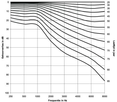 Acuut idiopathisch gehoorverlies ontstaat snel, binnen enkele dagen. Het betreft meestal een eenzijdig perceptief gehoorverlies waarvan de helft van de mensen spontaan geneest; de andere helft heeft blijvend gehoorverlies. 6 Bij lawaaidoofheid is langdurige blootstelling aan lawaai de belangrijkste factor bij het verminderde gehoor. Omgevingsgeluid dat hard genoeg is om een pijnsensatie of een tijdelijk gevoel van doofheid te veroorzaken (>80 dB) kan beschadiging van het binnenoor veroorzaken. Dit uit zich bij audiometrie in een lawaaidip bij 4 kHz, die soms oploopt tot 40 à 50 dB. Bij presbyacusis is het gehoorverlies meestal het resultaat van alle grotere en kleinere gehoorbeschadigingen van midden- en binnenoor die in de loop van het leven zijn opgelopen door bijvoorbeeld otitis media, lawaai en ototoxische beschadiging. Het meest kenmerkend is de degeneratie van haarcellen. Deze degeneratie is het grootst in de basale windingen van het slakkenhuis en gaat gepaard met het verdwijnen van de bijbehorende zenuwvezels. Bij het ouder worden vermindert ook de beweeglijkheid van het trommelvlies en de gehoorbeentjes, waardoor er een geleidingscomponent bijkomt. 1 Bij ouderen vanaf 60 jaar treedt gehoorverlies in de hoge tonen op. Dat neemt toe naarmate de leeftijd vordert ( figuur 1). Een kwart van alle 65-plussers heeft een zodanig gehoorverlies (35 dB bij 1,2 en 4 kHz) dat een hoortoestel geïndiceerd is. 7 Bij de ziekte van Ménière komt de slechthorendheid in aanvallen voor en gaat gepaard met duizeligheid en oorsuizen. Waarschijnlijk veroorzaakt hydrops in het labyrint de klachten. Slechthorendheid ten gevolge van geneesmiddelen is zeldzaam (oorzaak voor circa 0,2% van totale slechthorendheid en doofheid) en wordt in de meeste gevallen (circa 75%) veroorzaakt door antibiotica (aminoglycosiden) en in 15% van de gevallen door kinine- en salicylpreparaten. 8