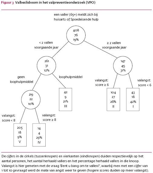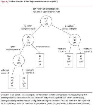 Valincidenten vormen globaal de derde oorzaak van chronische invaliditeit bij ouderen vanaf 65 jaar volgens de gegevens van de WHO.1 Circa 30% van de ouderen valt ten minste eenmaal per jaar en 15% zelfs tweemaal of vaker.23 Circa 68% van alle valpartijen leidt tot een verwonding en 5% tot een fractuur.45 Ongeveer een kwart van degenen die vallen, doet naar aanleiding van de val een beroep op de huisarts of het ziekenhuis.45 Onderzoek heeft uitgewezen dat ruim de helft van alle vijfenzestigplussers valangst ontwikkelt,6 en dat dit soms leidt tot het vermijden van activiteiten en daardoor verminderde mobiliteit en eenzaamheid.7 De literatuur maakt onderscheid tussen ouderen die incidenteel vallen en ouderen die herhaaldelijk vallen.8 Incidentele valpartijen zijn veelal te wijten aan omgevingsfactoren, herhaald vallen is eerder het gevolg van fysieke, cognitieve en gedragsfactoren zoals balansproblemen, cognitieve achteruitgang of haastig gedrag.9 Met name mensen die vaker vallen, hebben baat bij preventieve maatregelen. Om te kunnen bepalen wie voor zulke maatregelen in aanmerking komt, zijn in de afgelopen jaren wereldwijd tal van risicoprofielen ontwikkeld, te gebruiken als voorspellend screeningsinstrument.10111213 Voor de dagelijkse praktijk hebben deze risicoprofielen echter onvoldoende onderscheidend vermogen, want ze zijn ontworpen in ongeselecteerde populaties en dus niet toegesneden op populaties met specifieke kenmerken. De doelgroep, ouderen die hulp zoeken na een val, heeft nu juist wél specifieke kenmerken, namelijk leeftijd en gezondheid. Bekend is dat risicoprofielen meer voorspellende waarde hebben in de populaties waarin ze zijn ontwikkeld dan in andere populaties, en het zou dus beter zijn een risicoprofiel te ontwikkelen op basis van een representatieve steekproef uit de populatie waarin men het instrument in de praktijk gaat gebruiken.14 Een ander nadeel van de bestaande risicoprofielen is dat een enkelvoudige uitslag de patiënt weinig zegt: ‘U heeft een hoog risico om in de komende twaalf maanden opnieuw te vallen’, of: ‘U scoort 8 punten op een schaal van 0 tot 30’. Een screeningsinstrument in de vorm van een beslisboom levert niet alleen een uitslag – de kans op een nieuwe val, uitgedrukt als percentage – maar ook de onderbouwing daarvan. Dat geeft de patiënt meer inzicht. Wij hebben een valbeslisboom ontwikkeld die praktisch bruikbaar is in de huisartsenpraktijk en op de Spoedeisende hulp, met eenvoudig meetbare predictoren en die een voor de patiënt begrijpelijke uitslag oplevert. In dit artikel beschrijven we de ontwikkeling en validering van deze valbeslisboom.