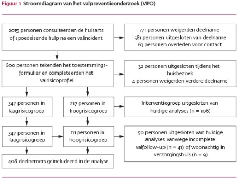 De ontwikkeling van de valbeslisboom vond plaats in het kader van het valpreventieonderzoek (VPO). Dit onderzoek vond plaats onder vijfenzestigplussers in het verzorgingsgebied (postcoderegio) van het VU medisch centrum die na een valincident de afdeling Spoedeisende hulp (SEH) van het VUmc of hun huisarts bezochten.15 De deelnemers woonden zelfstandig (inclusief aanleunwoningen en serviceflats) of in een verzorgingshuis, waren wilsbekwaam en in staat om zelf vragenlijsten te beantwoorden. Ook patiënten met ernstige letsels kwamen in aanmerking, mits zij binnen drie maanden voldoende herstelden. Verkeers- of bedrijfsongevallen werden uitgesloten. Tussen april 2005 en juli 2007 benaderden wij 2015 patiënten die zich bij de SEH of de huisarts meldden (figuur 1), en wij vonden 564 patiënten bereid tot deelname. De deelnemers kregen binnen drie maanden na de presenterende val een huisbezoek en tekenden het toestemmingsformulier. Vervolgens bepaalden wij het risico op herhaald vallen met behulp van het LASA-valrisicoprofiel (range 0-30).12 Een score van 7 of lager gold als laag risico (n = 347), een score van 8 of hoger gold als hoog risico (n = 217). Wij wezen de deelnemers met hoog risico gerandomiseerd toe aan een behandel- en een controlegroep. De behandelgroep hielden wij buiten de analyses, omdat de behandeling het valrisico zou kunnen beïnvloeden en zou kunnen leiden tot een onderschatting van het voorspellende vermogen van de valbeslisboom. Van de in totaal 458 deelnemers in de laagrisicogroep en de controlegroep lieten wij er 50 buiten de analyse omdat zij in een verzorgingshuis woonden of geen complete valfollow-up hadden. Deze 50 deelnemers waren gemiddeld ouder (p ≤ 0,05) dan de 408 deelnemers die wij uiteindelijk in de analyse hebben meegenomen.