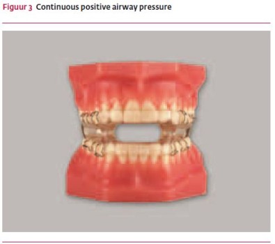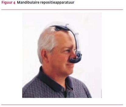 Wanneer bovenstaande maatregelen geen effect hebben, kan men bij sommige patiënten mechanische hulpstukken in de mond plaatsen.12 Mandibulaire repositieapparatuur (MRA) is met succes toegepast [figuur 3]. MRA maakt de bovenste luchtwegen ruimer doordat de tongbasis, epiglottis en palatum molle naar voren worden gehouden. Tevens activeert de apparatuur de palatum-, tong- en farynxmusculatuur, waardoor de weerstand van de bovenste luchtwegen afneemt. Uit onderzoek blijkt dat patiënten MRA vaak moeilijk accepteren.13