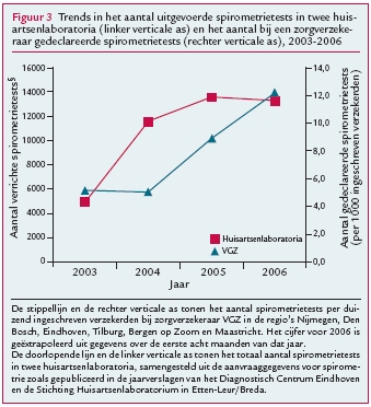 Spirometrie in eigen beheer vereist specifieke kennis en kwaliteitswaarborging. Daarbij gaat het niet alleen om de bediening maar ook om controle en onderhoud – hetgeen wij al eerder omschreven als een kwetsbaar aspect van spirometrie in eigen beheer van de huisartsenpraktijk.5 Om te controleren hoe accuraat een spirometer longfunctiewaarden meet, moet de meter periodiek geijkt en gecontroleerd worden aan de hand van internationale richtlijnen, ongeacht de leeftijd van het apparaat.13 Nalatigheid in dit opzicht vergroot de kans dat spirometrietests van onvoldoende kwaliteit leiden tot onjuiste diagnosen en/of misclassificatie van patiënten. In dit licht is het zorgwekkend dat in bijna 40% van de Nederlandse huisartsenpraktijken de spirometer nooit wordt gecontroleerd op accuraatheid en precisie. Ook de hygiëne van de apparatuur is een actueel onderwerp. Vooral de sensoren van de spirometer, die ook inspiratoire longfunctiewaarden meten, kunnen bij onvoldoende hygiëne in theorie een bron van kruisbesmetting worden.13 Dat in ten minste 14% van de huisartsenpraktijken de spirometrieapparatuur nooit wordt gereinigd, zoals uit onze gegevens blijkt, suggereert dat het potentiële infectiegevaar niet altijd wordt onderkend. Overigens bestaan er vooralsnog geen harde bewijzen dat zich kruisbesmettingen hebben voorgedaan via longfunctieapparatuur in de eerste lijn.14 Daarbij komt dat geforceerde inspiratoire manoeuvres bij metingen in de huisartsenpraktijk vaak niet strikt noodzakelijk zijn en achterwege kunnen blijven. In theorie neemt daardoor de kans op besmetting af. De laatste jaren is het aantal spirometrietests dat in huisartsenpraktijken en huisartsenlaboratoria verricht wordt duidelijk toegenomen. Uit de in figuur 3 getoonde gegevens van zorgverzekeraar VGZ blijkt dat het aantal declaraties voor verrichte spirometrietests in huisartsenpraktijken in vier jaar tijd meer dan verdubbeld is: van 5,2 tests per 1000 verzekerden in 2003 naar 12,2 in 2006. Een mogelijke verklaring is het opnemen van de M&I-module in het huisartsencontract, waardoor huisartspraktijken een vergoeding krijgen voor de investering in tijd, personeel en apparatuur. Ook de toegenomen beschikbaarheid van praktijkondersteuners zal hierbij een rol spelen. De jaarverslagen van twee huisartsenlaboratoria, het Diagnostisch Centrum Eindhoven (http://www.diagnostischcentrum.nu) en de Stichting Huisartsenlaboratoratium Etten-Leur/Breda (http://www.shlbreda.nl), laten zien dat ook hier het aantal spirometrietests in de afgelopen jaren sterk gestegen is. In 3 jaar tijd steeg in het aantal verrichte spirometrietests met 72%, waarop overigens wel een afvlakking volgde in 2006. De toegenomen aandacht voor spirometrie in de huisartsenpraktijk lijkt dus niet louter afhankelijk van de financiële prikkel.