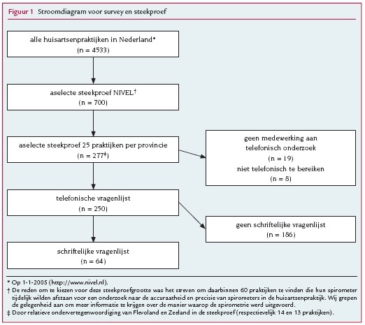 Voor dit onderzoek gebruikten wij 3 gegevensbronnen. Ten eerste deden wij een telefonische survey in 277 praktijken uit een aselecte steekproef van 700 Nederlandse huisartsenpraktijken, gewogen per provincie. De steekproef was afkomstig uit de databank van het Nederlands instituut voor onderzoek van de gezondheidszorg (NIVEL). Per provincie benaderden wij aselect 25 praktijken uit het steekproefbestand voor een kort gestructureerd telefonisch interview, met als doel het bezit en gebruik van spirometers te inventariseren. Daarnaast beschikten wij over de gegevens van een zorgverzekeraar over het aantal spirometrietests dat gedeclareerd was door huisartsenpraktijken in Zuid-Nederland, en ten derde kregen wij inzage in de jaarcijfers van twee huisartsenlaboratoria, eveneens in het zuiden van het land.
