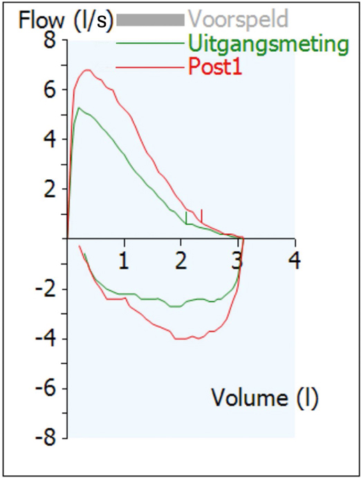 Figuur 1 | Flow-volumecurves. De uitgangsmetingen corresponderen met de pre-waarden in de tabellen.