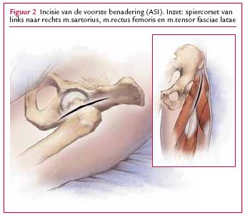 Twee benaderingen zijn aan te merken als standaard voor de totale heupoperatie: de posterolaterale (PL) en de direct laterale benadering. De laatstgenoemde benadering heeft nog een variant: de anterolaterale. Bij de posterolaterale benadering wordt de heup bereikbaar door de exorotatoren los te maken. Voordeel van deze methode is dat de abductoren minder beschadigen, wat een Trendelenburggang tegengaat. Nadeel is mogelijk een grotere kans op luxatie als het kapsel en exorotatoren niet voldoende teruggehecht worden. Ook neemt na intramusculaire toegang (zoals bij de PL-benadering) het risico op spieratrofie toe. Bij de laterale benadering bereikt de chirurg de heup door de abductoren los te maken van de trochantor major. Deze benadering staat bekend als technisch lastiger dan de PL-benadering. Het luxatiegevaar is kleiner, maar een nadeel is de hogere incidentie van Trendelenburggang. De laatste tijd is ook de voorste benadering (figuur 2) weer in opkomst. Dit is een soort opleving van de oude Smith-Petersons benadering die niet meer uitgevoerd werd. Bij de voorste benadering plaatst de chirurg de totale heup via het intermusculaire planum van de tensor fascia lata en de musculus sartorius (figuur 2 en 3), zonder spieraanhechtingen vrij te prepareren zoals bij de laterale benaderingen of door een spier heen te gaan zoals bij de PL-benadering. Maar ook de voorste benadering heeft een aantal nadelen: met name de beperkte toegankelijkheid tijdens de operatie en het risico op beschadiging van de n. femoralis cutaneus. De verschillen tussen de benaderingen zijn beperkt en daarom is er op dit moment nog geen duidelijke voorkeur. In navolging van andere vakgebieden en andere ingrepen binnen de orthopedie zoekt men naar minder invasieve methoden om een prothese te plaatsen, de minimaal invasieve chirurgie (MIS). Er zijn echter nog geen goede onderzoeken gepubliceerd die aantonen dat MIS een duidelijke meerwaarde heeft. Hetzelfde geldt voor genavigeerd plaatsen van een prothese.