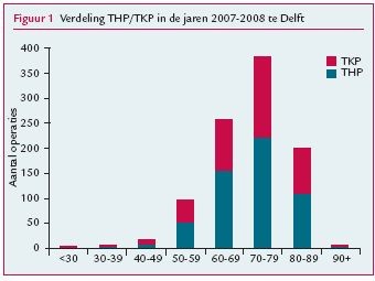 De belangrijkste indicaties voor een THP en TKP zijn nachtelijke pijn en sterk verminderde actieradius. Door het succes van de behandeling zien we echter dat artsen tegenwoordig sneller dan voorheen kiezen voor het plaatsen van een prothese. Een duidelijke ondergrens is er niet, hierover verschillen de meningen wereldwijd en binnen Nederland sterk. De leeftijdsopbouw staat weergegeven in figuur 1. Omdat een prothese niet altijd voldoet aan het hoge activiteitenniveau van de patiënt en omdat de levensduur van een prothese mede afhankelijk is van dit activiteitenniveau, is het beleid in Nederland toch terughoudend. Slijtage van de prothese leidt tot osteolyse rond de prothese. Door osteolyse worden de revisieoperaties veelal steeds uitvoeriger en dus riskanter.