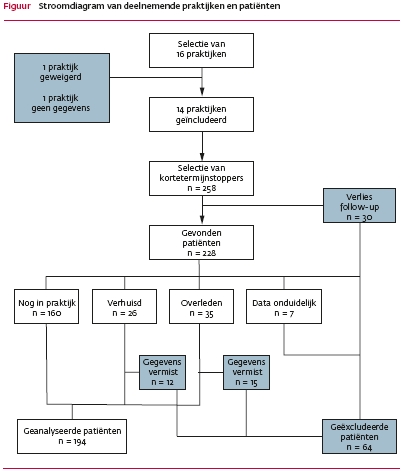 Tussen 1998 en 2001 vond een groot prospectief, gecontroleerd, stapsgewijs interventieprogramma plaats onder huisartspatiënten die al lange tijd benzodiazepines gebruikten (Benzoredux). De eerste stap in dit programma was een stopbrief die de huisarts verstuurde. Na 3 maanden kregen de patiënten een uitnodiging voor een evaluatieconsult bij de huisarts. Patiënten die op dat moment nog steeds benzodiazepines gebruikten kregen het verzoek deel te nemen aan stap 2: een gerandomiseerde gecontroleerde trial met gereguleerde dosisafbouw door de eigen huisarts. Een patiënt was een langdurig benzodiazepinegebruiker als hij langer dan 3 maanden benzodiazepines voorgeschreven had gekregen én als hij in de laatste drie maanden recepten had gekregen voor ten minste 60 dagen benzodiazepinegebruik. We includeerden 2425 langdurig gebruikers uit 27 deelnemende praktijken. Voor het huidige onderzoek selecteerden we patiënten uit het Benzoredux-onderzoek die 3 tot 6 maanden na de stopbrief waren gestopt met benzodiazepinegebruik – en dus alleen aan stap 1, de stopbrief, hadden meegedaan. Uit praktische overwegingen bezochten we alleen de 14 praktijken uit de regio Nijmegen. We identificeerden de patiënten in het systeem aan de hand van geslacht, geboortedatum en identificatienummer, waarna we de gegevens handmatig uit het HIS extraheerden.