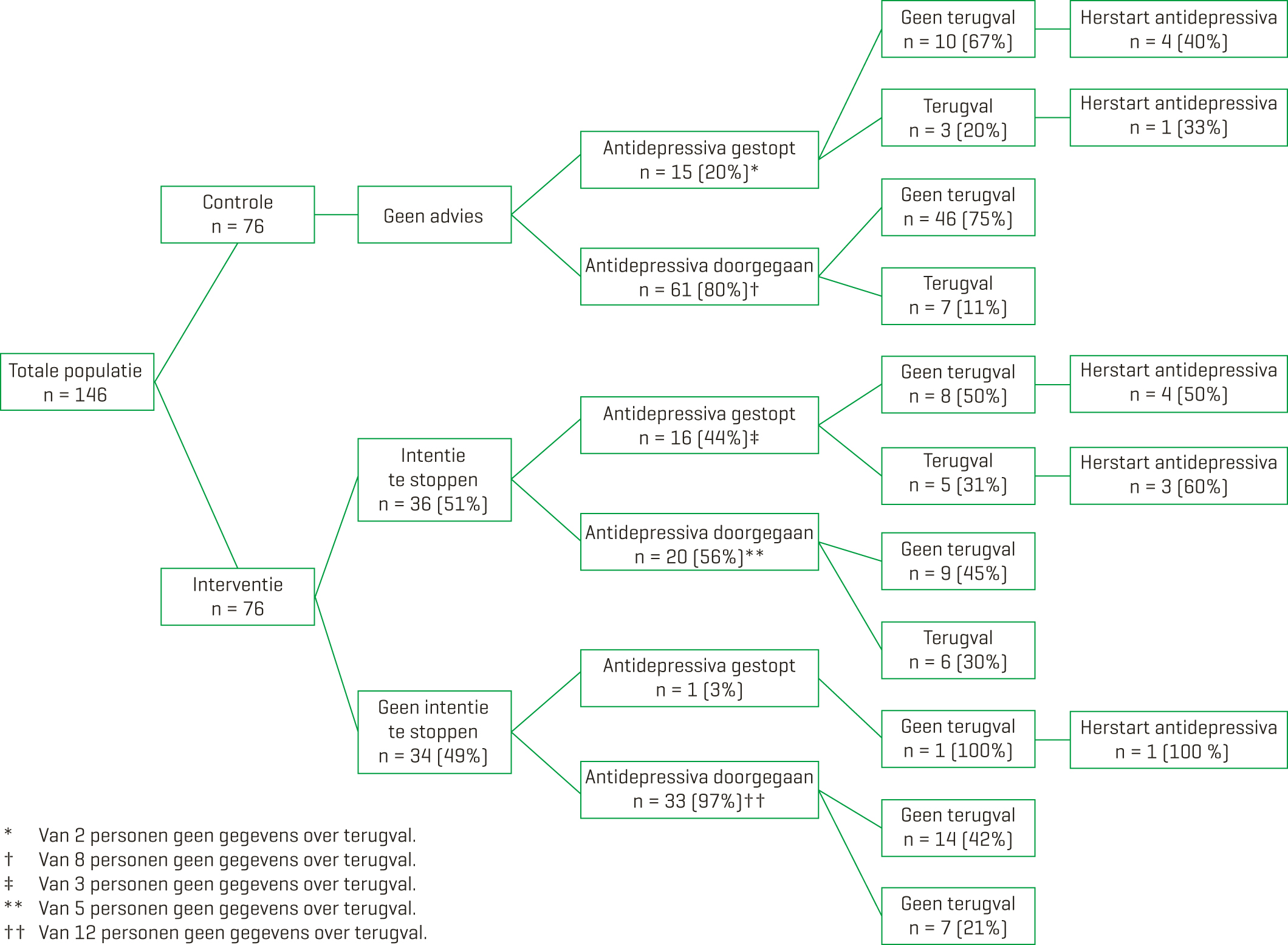 In de interventiegroep stopten 4 patiënten (6%, 95%-BI 2 tot 14) met de antidepressiva, in de controlegroep stopten er 6 (8%, 95%-BI 4 tot 16). In de interventiegroep lag het terugvalpercentage hoger (n = 18/70, 26%) dan in de controlegroep (n = 10/76, 13%, p = 0,05). De patiënten die met succes stopten verschilden wat betreft leeftijd, geslacht, type antidepressivum of psychiatrische diagnose niet van degenen die niet stopten.