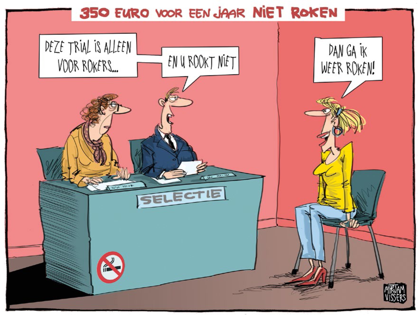 Voor verzekeraars zijn de resultaten van ons onderzoek wellicht aanleiding om niet alleen de stoppen-met-rokenbehandeling zelf te vergoeden, maar ook na te denken over een financiële beloning voor degenen die met succes weten te stoppen. Dat zou de behandeling effectiever maken.