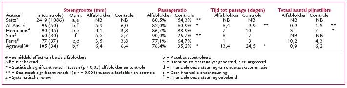Vraagstelling Voor patiënten met heftige koliekpijn bij urolithiasis zijn er weinig andere opties dan symptoombestrijding. De NHG-Standaard Urinesteenlijden vermeldt dat de huisarts het off-labelgebruik van tamsulosine kan overwegen.1 Voor ons reden om dit vrijblijvende advies uit 2005 nader te bestuderen. Dragen alfablokkers in de behandeling van symtomatische urolithiasis bij aan versnelde passage en/of pijnreductie? Zoekstructuur Zoektermen in PubMed: Urolithiasis AND alpha blocker. Limits: Humans, Meta-Analysis, Randomized Controlled Trial, Review, English, Publication Date from 2005/08/01 to 2010/03/01. Literatuur voor 2005/08/01 is meegenomen in de besluitvorming van de huidige NHG-Standaard. Resultaten De zoekstrategie leverde 44 artikelen op: 14 reviews en 30 RCT’s. Geëxcludeerd werden RCT’s in combinatie met lithotripsie (vergruizen) (9), stents (3), corticosteroïden (1), tweedecyclusbehandeling (1), kinderen (1) en bijwerkingen (1). Dit resulteerde in 14 RCT’s die nog niet in de besluitvorming van de NHG-Standaard waren meegenomen. Recent verscheen een review waarin 9 van deze RCT’s zijn verwerkt.2 We hebben ons op deze review geconcentreerd en op de 5 RCT’s die niet in deze review werden meegenomen.234567 Bespreking Het systematische literatuuronderzoek beschrijft 29 RCT’s; slechts twee RCT’s waren placebogecontroleerd, slechts één dubbelblind.2 Van de vijf niet in de review opgenomen RCT’s waren er twee dubbelblind en drie placebogecontroleerd.347 De onderzoekspopulaties waren relatief klein (30 tot 50 patiënten in behandelingsgroep). Alle patiënten konden zonodig pijnmedicatie krijgen. De resultaten zijn samengevat in de tabel. De passageratio is bij de review en bij drie RCT’s significant hoger in de alfablokkergroep.2357 De tijd tot passage is bij twee RCT’s significant korter, het aantal benodigde pijnstillers is bij twee RCT’s significant lager bij alfablokkergebruik.37