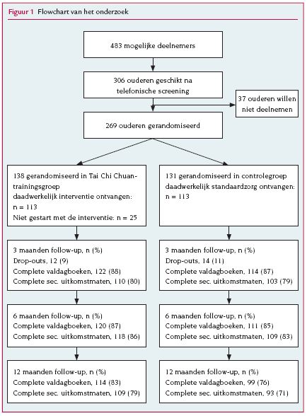 Dit is het eerste Europese onderzoek naar de effecten van Tai Chi Chuan op het valrisico bij ouderen en de resultaten moeten dan ook in deze context bekeken worden. De ouderen komen uit twee gemeenten in het westen van het Nederland: Dordrecht en Zwijndrecht. We hielden de drempel om mee te doen aan het onderzoek zo laag mogelijk door de kosten en de tijdsinvestering te minimaliseren. Dit resulteerde in een iets lagere uitval (n = 26, 19%) dan de vooraf ingecalculeerde uitval van 20% en acceptabele loss to follow-uppercentages. Het gebrek aan positieve resultaten voor Tai Chi Chuan als het gaat om valpreventie kan niet verklaard worden door een powerprobleem, onverwachte goede resultaten in de controlegroep of geringe therapietrouw. Immers, in de per-protocolanalyse (die zich beperkte tot ouderen die voldoende therapietrouw waren) was het valrisico tussen de groepen wederom vergelijkbaar. Aangezien 60% van de deelnemende ouderen gedurende het onderzoeksjaar viel, gaan we ervan uit dat we een populatie met een verhoogd valrisico hebben geselecteerd. Immers, uit eerder onderzoek blijkt dat 30% van de ouderen van 65 jaar en ouder gemiddeld één keer per jaar valt. 123 Zelfs al hadden de ouderen geen verhoogd valrisico vanwege balansproblemen, ze hadden wel een verhoogd valrisico op basis van andere factoren. Vervolganalyses zullen worden gericht op het identificeren van specifieke valrisicofactoren binnen deze groep. Ook zullen we ingaan op mogelijke beperkingen van zelfrapportage bij het identificeren van valrisicofactoren.
