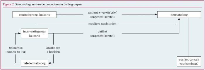 Het trainingsprogramma voor de huisartsen in de interventiegroep omvatte digitaal fotograferen, het downloaden van beelden naar de computer, het beheren van bestanden en het gebruik van de website. (Ter voorbereiding hadden wij, in een andere regio, een pilotonderzoek uitgevoerd om de camera en de onderzoekswebsite te testen en de training, de logistiek en het proces te optimaliseren.) Ook de dermatologen instrueerden we hoe ze de website moesten gebruiken en hoe zij de onderzoeksformulieren moesten invullen. De huisartsen maakten bij elke patiënt die in aanmerking kwam vier digitale beelden van het huidprobleem (twee close-ups en twee overzichtsfoto’s), en stuurden deze in met een semigestructureerd formulier via een beveiligde website (de KSYOS TDCS teledermatologiewebsite www.ksyos.org, die werd aangepast voor het onderzoek). De gebruikte camera was een Kodak EasyShare CX6230 van 2,0 megapixel, met macrofunctie. In het webformulier moesten de huisartsen de vragen over duur en locatie van de huidaandoening en de reden voor verwijzing verplicht beantwoorden. Omdat juist onwetendheid omtrent de diagnose reden kan zijn voor een verwijzing, was de vermoedelijke diagnose optioneel. De huisarts kon één belangrijkste reden voor verwijzing selecteren: vaststelling van de diagnose, behandeling, advies of geruststelling.11 De huisartsen konden het teleconsult aanvragen bij een van de deelnemende dermatologen. Deze werd per e-mail geïnformeerd dat er een teleconsult was aangevraagd, bekeek de beelden en de andere gegevens, en reageerde via dezelfde beveiligde website. De dermatoloog adviseerde de huisarts over de verdere procedures (advies voor behandeling, nadere onderzoeken, standaard of urgente verwijzing) en gaf deze terugkoppeling binnen 48 uur, met kennisgeving via een e-mailbericht. De huisarts kon hierna de dermatoloog eenmalig om aanvullende informatie vragen. Aan het eind van het consult vulde de huisarts een evaluatieformulier in. De onderzoekers ontvingen alleen geanonimiseerde patiëntgegevens. In de controlepraktijken werden alle patiënten volgens de gebruikelijke procedure naar een dermatoloog verwezen. In meeste gevallen betekende dit dat de patiënt de polikliniek bezocht met een brief waarin de huisarts de toestand van de patiënt beschreven had. Alle patiënten, zowel die uit de interventiegroep als die uit de controlegroep, kregen het verzoek om na de reguliere wachttijd van ongeveer een maand een poliklinisch bezoek aan de dermatoloog te brengen, onafhankelijk van de mate van herstel. De patiënten in de interventiegroep bezochten bij deze gelegenheid dezelfde dermatoloog die het teledermatologisch consult gevoerd had (figuur 2).