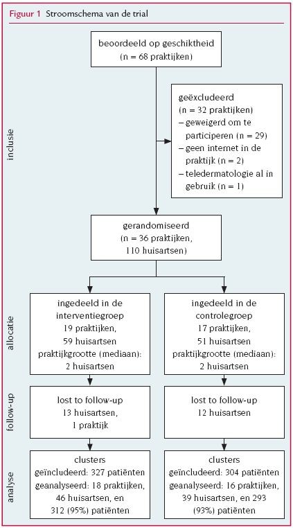 Naar het oordeel van de deelnemende dermatologen kan de beschikbaarheid van teledermatologie in de huisartsenpraktijk eenvijfde van de poliklinische dermatologische consulten voorkomen, alle diagnosen bij elkaar genomen. De belangrijkste reden dat een consult voorkomen kan worden, is dat de patiënt inmiddels hersteld is. Veronderstellende dat de patiënten die na het teledermatologische consult de dermatoloog of de huisarts niet opnieuw bezochten hersteld of herstellende waren, was bijna 50% van deze patiënten hersteld of voldoende geholpen met het teledermatologische consult, terwijl bij de traditionele verwijzingsmethode slechts 15% geen vervolgconsult behoefde. Een andere reden dat de dermatologen een persoonlijk consult als voorkombaar bestempelden, was dat de huisarts de patiënten zelf zou hebben kunnen helpen. Dit gold voor de controlegroep vaker dan voor de teledermatologiegroep, maar het ging in beide groepen om bijna dezelfde proportie. Kennelijk vonden de dermatologen, ook wanneer zij de huisarts teledermatologisch konden adviseren, nog steeds dat deze zelf meer behandelingen had kunnen uitvoeren. Daar zijn meerdere mogelijke verklaringen voor. Wellicht schatten dermatologen de dermatologische kennis, middelen en kunde van huisartsen verkeerd in, of hebben huisartsen te weinig zelfvertrouwen om dermatologische aandoeningen zelf te behandelen. De meest voorkomende diagnose, goedaardige huidtumor, blijkt niet geschikt voor een standaard teledermatologisch consult. Informele discussies met de dermatologen, met name in de pilotfase, suggereerden al dat zij patiënten met deze diagnose bij voorkeur persoonlijk zien om eventuele maligniteit uit te sluiten. In de toekomst kunnen nieuwe technieken van teledermatoscopie en macrofotografie de dermatoloog wellicht in staat stellen de huisarts ook in deze gevallen veilig te adviseren.2122 In ons onderzoek hebben wij alle dermatologische patiënten geïncludeerd zonder te focussen op een specifiek ziektebeeld. Het is aannemelijk dat teledermatologie voor bepaalde patiëntengroepen, zoals verpleeghuisbewoners, meer effect zal hebben op het aantal verwijzingen dan voor andere groepen.23 Ons onderzoek suggereert dat teledermatologie bruikbaar kan zijn om de patiënt gerust te stellen. Het aantal patiënten dat zelf om een consult verzocht, was aanzienlijk hoger in de controlegroep dan in de interventiegroep. Nader onderzoek naar dit aspect zou inzicht kunnen verschaffen in de mogelijkheden van teledermatologie (en telegeneeskunde in het algemeen) om tegemoet te komen aan de toenemende zorgvraag van veeleisende patiënten. De patiënttevredenheid in het algemeen en de tevredenheid over het interpersoonlijke contact zijn bij teledermatologie niet groter of minder groot dan bij de traditionele verwijsmethode. Wallace et al.5 hebben, met dezelfde vragenlijst, wel een significant verschil geconstateerd, maar Bowns et al.24 vonden geen verschil. Weliswaar hebben wij het niet specifiek gemeten, maar de huisartsen in de teledermatologiegroep meldden wel dat hun patiënten zeer enthousiast reageerden op de uitnodiging voor het onderzoek. Het verraste ons dan ook dat onze Patient Satisfaction Questionnaire dit enthousiasme niet reflecteerde, ondanks het feit dat een aanzienlijk deel van de teledermatologische patiënten hersteld was. Ook Salisbury et al.25 vonden bij hun evaluatie van een special interest dermatologieservice voor huisartsen geen verschil in patiënttevredenheid, hoewel de patiënten in hun interventiegroep eerder hersteld waren dan die in de controlegroep.25 Het lijkt erop dat vroeger herstel niet het belangrijkste aspect is voor patiënten met huidaandoeningen. Voor zover bekend is dit het eerste clustergewijs, gerandomiseerde onderzoek op het gebied van telegeneeskunde. Een dergelijk onderzoeksdesign vereist grote aantallen clusters, in ons geval huisartsenpraktijken en huisartsen, en dat maakt het lastig om voldoende patiënten te includeren en het onderzoek te coördineren. Toch zijn we ervan overtuigd dat randomisatie per cluster de geschiktste methode is, omdat wij op het niveau van de praktijk een aanzienlijke intraclustercorrelatie (0,071) vonden voor onze primaire uitkomst. Ook op het niveau van de huisartsen, die wij gebruikten als clusterende eenheid in de statistische analyse, was de intraclustercorrelatie sterk (0,080). Op grond van onze sample size-berekening hadden we vijftig huisartsen en duizend patiënten nodig, en we schatten dat we per huisarts 25 à 30 patiënten moesten includeren, een aantal dat haalbaar leek op basis van de nationale registratie van verwijzingen naar dermatologie. Gedurende de trial includeerden de deelnemende huisartsen minder patiënten dan voorspeld, maar doordat het aantal huisartsen hoger was dan beoogd (85 in plaats van de geraamde 50), heeft het onderzoek toch voldoende power, zij het met minder patiënten. De demografische kenmerken van de patiënten waren vergelijkbaar in de beide gerandomiseerde groepen, maar er waren wat verschillen in de diagnoses en dat kan de vergelijking verstoren. De randomisatieprocedure had tot doel dat er zo min mogelijk selectiebias was voordat de randomisatie plaatsvond, maar het is mogelijk dat de huisartsen ondanks onze instructies toch selectief te werk gingen bij het uitnodigen van patiënten. Daar staat tegenover dat ons selectieproces van huisartsen de situatie weerspiegelt die ontstaat zodra teledermatologie een regulier onderdeel van de zorg is. De introductie van teledermatologie brengt met zich mee dat de huisarts de computer meer moet gaan gebruiken. In ons onderzoek hebben de nieuwe technologie en het grote aantal deelnemers ertoe geleid dat er relatief veel uitkomstformulieren ontbraken. Andere grote gerandomiseerde onderzoeken hebben vergelijkbare problemen ondervonden.521 Dit zou de resultaten van de standaard statistische analyse, die zich beperkt tot de gevallen waarvan de gegevens volledig zijn, kunnen vertekenen.19 Toch hebben we met beh