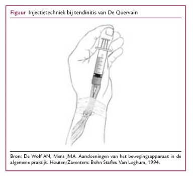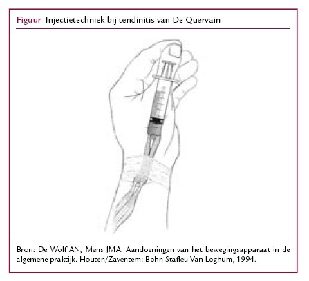 De huisarts kan een patiënt met een De Quervain-tendinitis goed behandelen. Bij kort bestaande en/of geringe klachten kan immobilisatie van het polsgewricht met behulp van een spalk en een NSAID wellicht enige verbetering geven. Bij langer bestaande en/of ernstige pijnklachten is spalkbehandeling niet effectief, maar een lokale corticosteroïdinjectie is dat wel. Soms zijn er meerdere injecties nodig. Bij onvoldoende verbetering kan de huisarts overwegen de patiënt naar een (plastisch) chirurg te verwijzen voor het operatief klieven van de peesschede. Een NSAID heeft geen toegevoegde waarde aan de behandeling van zowel de injectie als de spalk.