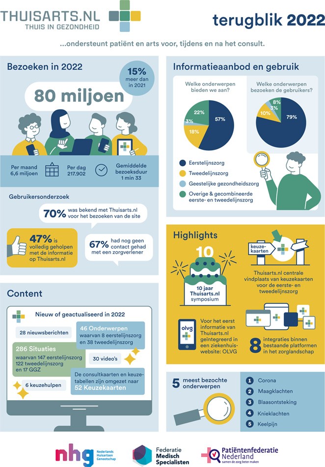 In 2022 vierde Thuisarts.nl het 10-jarig bestaan, werd de website 80 miljoen keer bezocht en was corona het meest bezochte onderwerp. Deze en andere highlights en cijfers uit 2022 zijn te vinden in de infographic.