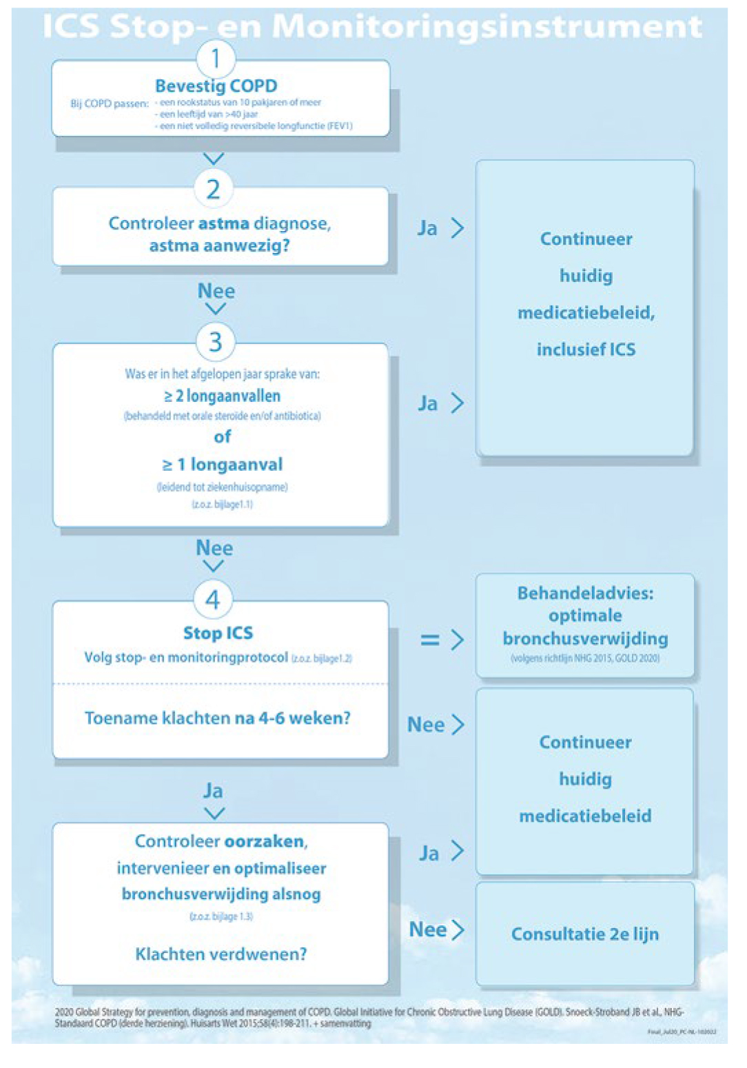 Het stop- en monitoringsinstrument is gebaseerd op de NHG-Richtlijn COPD, opgesteld door eerste- en tweedelijns longexperts.19 Het bestaat uit een stroomschema waarin belangrijke vragen rondom het gepast gebruik van ICS worden gesteld en een stop- en monitoringsprotocol. Dit protocol is te vinden op www.cahag.nl.
