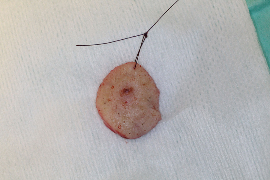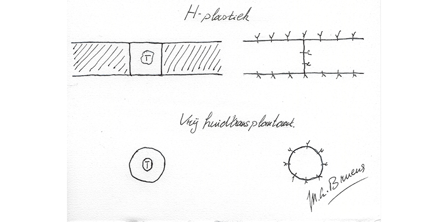 Het aanbod van nascholingen dermatologie is beperkt. Als het om dermato-oncologie gaat, beperkt het zich vaak tot plaatjes kijken. Op de NHG STiP-cursus Verdachte huidafwijkingen kun je leren een stansbiopt af te nemen. Ook het aanbod van nascholingen voor kleine chirurgie is minimaal. De scholing blijft meestal beperkt tot basisvaardigheden, zoals diverse hechttechnieken of het opzetten van een chirurgisch spreekuur. Zelf opereer ik regelmatig met een specialist mee om mijn eigen vaardigheden te verbeteren en uit te breiden. Via hem kon ik meedoen met een cursus Mini around the nose, bestemd voor snijdend specialisten in opleiding. In deze cursus werden verscheidene basisplastieken geoefend – zoals de O-Z-, de V-Y- en de H-plastiek – en het vrije huidtransplantaat [figuur 1]. Deze plastieken zijn niet ingewikkeld en kunnen poliklinisch, dus ook in de huisartsenpraktijk, worden uitgevoerd. Op deze cursus leerde ik ook dat in het gelaat veel meer primair kan worden gesloten dan ik dacht.