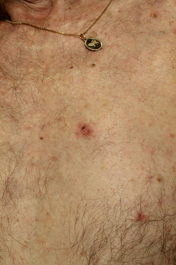 Een laesie parasternaal links; het stansbiopt toonde een solide BCC met sprieterige groeiwijze.