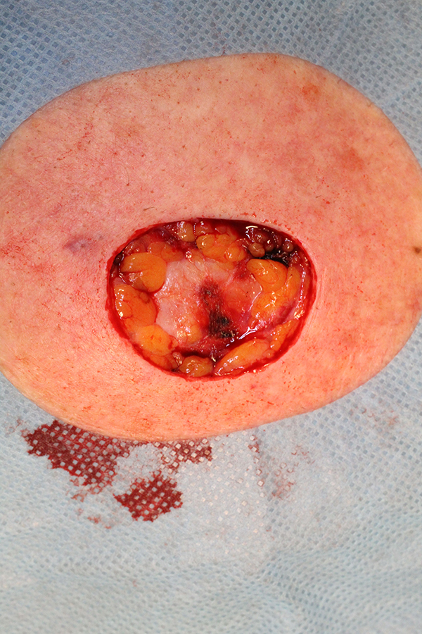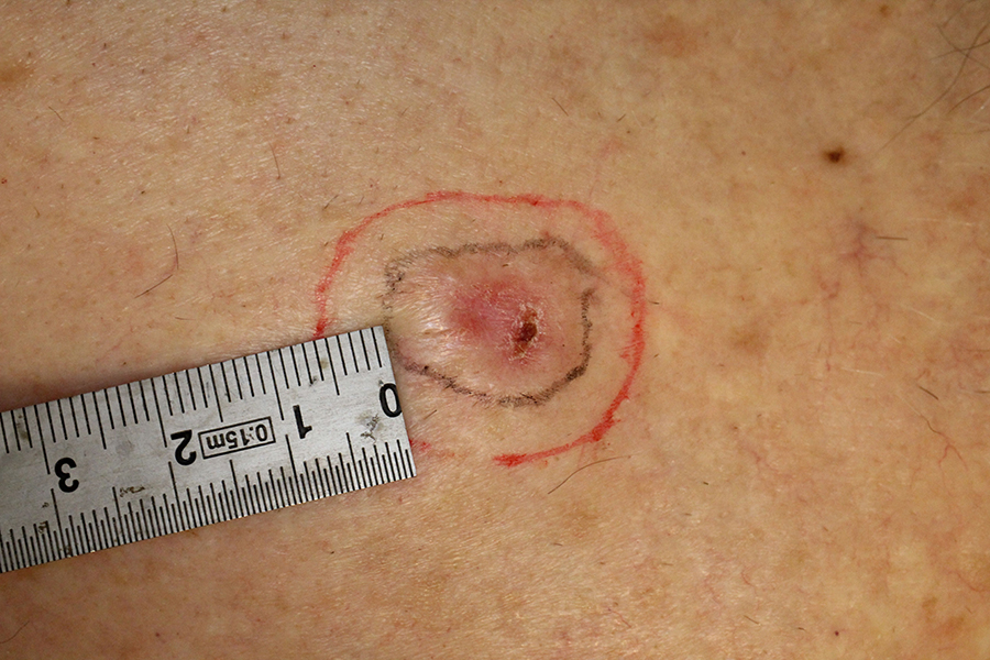 Figuur 2 | Een hoogrisico-basaalcelcarcinoom buiten het hoofd-halsgebied kan prima door de huisarts worden verwijderd.