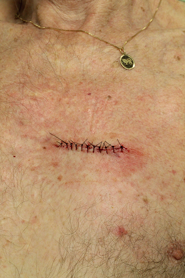 Chirurgie zou binnen de kaderopleiding als optie kunnen worden aangeboden. De chirurgische behandeling van NMSC zou mijns inziens verder kunnen gaan dan de huidige NHG-Standaard adviseert. Een hoogrisico-BCC buiten het hoofd-halsgebied kan prima worden verwijderd door een huisarts met interesse in dermato-oncologie [figuur 2]. Een huisarts met voldoende vaardigheden zou zelfs een excisie van NMSC in het hoofd-halsgebied en de H-zone kunnen uitvoeren. In dat opzicht zou een cursus zoals Mini around the nose zeer nuttig kunnen zijn. Kaderhuisartsen kunnen dan tijdens de opleiding chirurgisch vaardigheidsniveau 3 of 4 bereiken en zich als zodanig inschrijven in het CHBB-register. Door ook patiënten van andere huisartsen te zien, kunnen ze vervolgens hun diagnostische en chirurgische vaardigheden verder verbeteren en hun repertoire van ingrepen uitbouwen. Voor herregistratie zou de arts een portofolio moeten overhandigen met een minimum aantal ingrepen, al dan niet uitgevoerd samen met een specialist. Dit is vergelijkbaar met de CASPIR-herregistratie waarbij beoordeelde spirometrieën moeten worden aangeleverd.