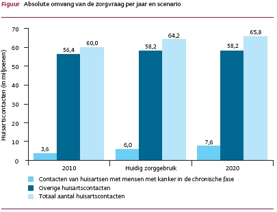 Als mensen met kanker in de chronische fase in 2020 twee extra contacten met de huisarts hebben, dan stijgt het totaal aantal contacten in de huisartsenpraktijk met deze groep tot 7,6 miljoen. Dat is meer dan een verdubbeling ten opzichte van 2010. Het totaal aantal contacten zal dan stijgen tot 65,8 miljoen en dat is een stijging van 10% ten opzichte van 2010.