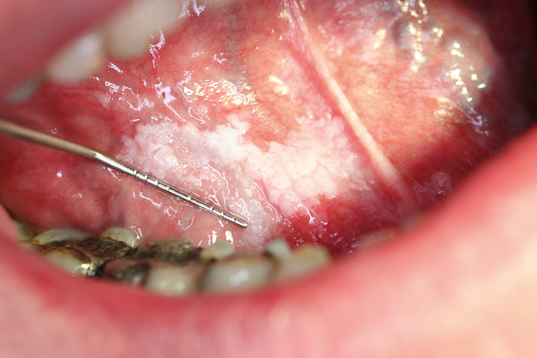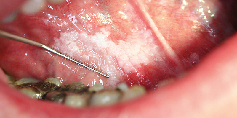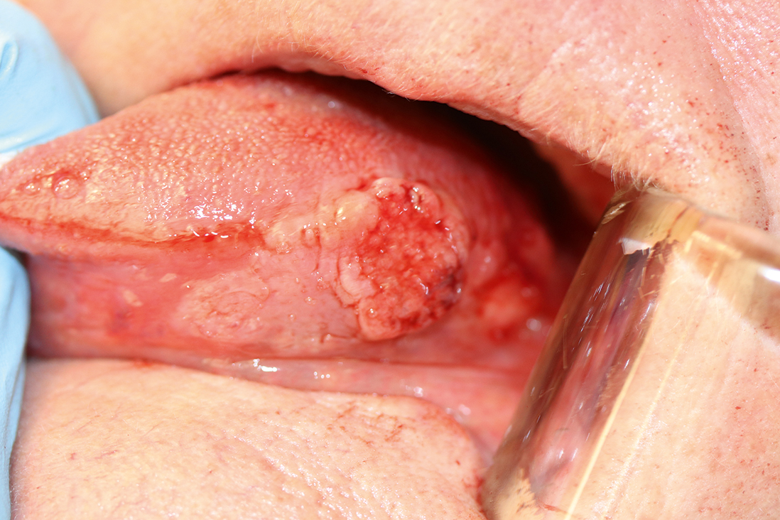 De aios in de casus stelde de werkdiagnose fibroom, een afwijking die veroorzaakt wordt door chronische irritatie van onder andere bijten of een slecht passende gebitsprothese. Een fibroom zit echter meestal op het wangslijmvlies of op de tongpunt, maar kan zich soms ook presenteren op de laterale tongrand. Een andere benigne tumor van de mondholte is het papilloom, een wratachtige afwijking veroorzaakt door het HPV-virus. Noch het fibroom, noch het papilloom geeft doorgaans pijnklachten en beide groeien exofytisch, in tegenstelling tot het tongcarcinoom [figuur 3].