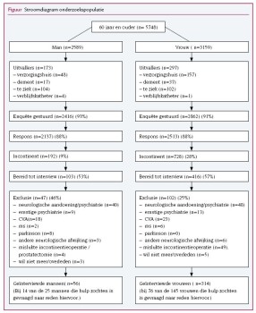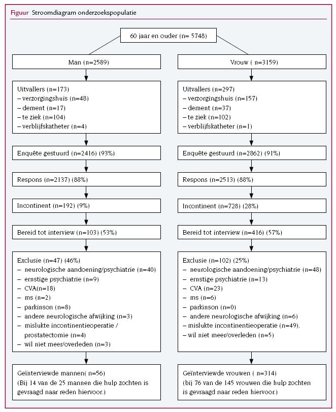 Dit onderzoek is een deel van een groter onderzoek naar urine-incontinentie bij ouderen, uitgevoerd in het oosten van Nederland tussen januari 1999 en januari 2001.1 De deelnemers waren afkomstig uit de populatie van 9 huisartsenpraktijken verbonden aan het Nijmeegs Monitoring Project, het academisch registratienetwerk van de afdeling Huisartsgeneeskunde van UMC St Radboud.14 Deze 9 huisartsenpraktijken met 28 huisartsen omvatten een totale populatie van 46.500 patiënten. De deelnemers waren de patiënten van 60 jaar of ouder die in een vragenlijst hadden aangegeven dat ze last hebben van UI (figuur 1). Uit de respons (88%) bleek dat 20% klachten had door UI; 56% van hen gaf aan deel te willen nemen aan het vervolgonderzoek. UI werd gedefinieerd conform de NHG-Standaard Urine-incontinentie: minstens twee keer per maand urineverlies.15 Nadruppelen bij mannen werd niet beschouwd als UI. Het onderzoek richtte zich op ongecompliceerde urine-incontinentie zoals beschreven in de NHG-Standaard. Patiënten met een neurologische of psychiatrische aandoening of een mislukte operatie wegens urine-incontinentie in het verleden, werden daarom buiten beschouwing gelaten (zie figuur 1). Het interview vond plaats bij de patiënt thuis en duurde één uur. De interviewers gebruikten (semi)gestructureerde vragenlijsten om de volgende kwantitatieve gegevens te verzamelen: achtergrondgegevens, het type incontinentie, de ziekte-specifieke kwaliteit van leven, de aanwezigheid van urogenitale klachten en de last die deze geven, en tot slot de ernst van de incontinentie.