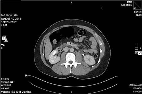 Na drie uur meldt patiënt zich wederom op de SEH. De buikpijn is heviger geworden, VAS 10. Het lichamelijk onderzoek toont nu diffuus drukpijn in abdomen met weliswaar enige défense musculaire, maar geen geprikkelde buik en geen slagpijn. De creatinine is nu 122, verder geen afwijkingen. De urine is schoon. De pijn breekt zelfs door tweemaal morfine 5 mg intraveneus en daarop wordt een spoed CT-abdomen met contrast gemaakt bij verdenking op mesenteriale ischemie, abdominale aortadissectie of appendicitis. De CT toont een obstruerende uretersteen links met blow-out van de linkernier en ureter met forse contrastlekkage [