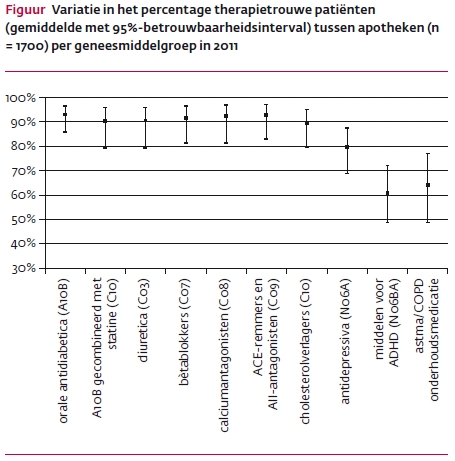 Er zijn verschillen tussen apotheken in de mate waarin hun patiënten therapietrouw zijn. De [figuur] laat deze spreiding per geneesmiddelengroep zien. Voor de meeste middelen geldt dat het verschil tussen apotheken ongeveer 11 (bij orale antidiabetica) tot 19% (bij antidepressiva) is. Dit is af te lezen aan het verschil tussen de boven- en ondergrens van het 95%-betrouwbaarheidsinterval van de betreffende geneesmiddelgroep. Dit verschil is duidelijk groter bij ADHD-medicatie (24%) en bij onderhoudsmedicatie voor astma/COPD (29%). De variatie tussen apotheken kan niet worden toegeschreven aan verschillen in leeftijd en geslacht van patiënten, noch aan verschillen tussen regio’s; op regionaal niveau (bekeken op tweecijferig postcodegebied) zijn de verschillen in therapietrouw kleiner. Dit wordt bevestigd door eerder onderzoek van Van Dijk e.a. waarin werd aangetoond dat variatie in therapietrouw niet door verschillen in de huisartspraktijkpopulatie of urbanisatiegraad worden veroorzaakt.