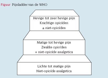Hoewel er maar weinig bewijs bestaat over het nut van de WHO-ladder blijkt deze tot nu toe een vrij goed bruikbare richtlijn. 10 De WHO-ladder bestaat inmiddels bijna 20 jaar en beschrijft de medicamenteuze aanpak van pijn volgens een 3-stapsmodel. 11 Dit model is later aangevuld met de volgende principes: geef de medicatie bij voorkeur oraal, op vaste tijden, toegesneden op de persoon, signaleer weerstanden en controleer de therapietrouw.