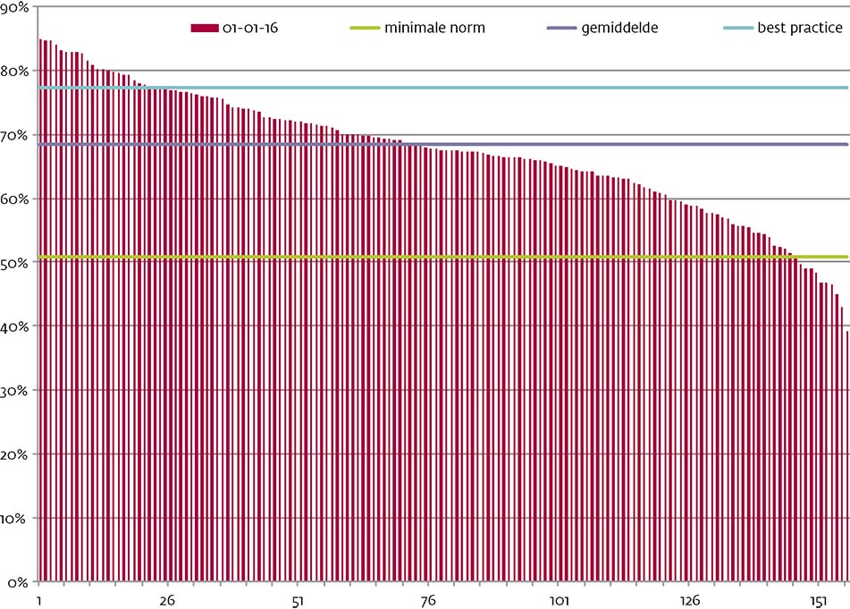 In [figuur 1] is de praktijkvariatie (156 huisartsenpraktijken) weergegeven van het percentage patiënten onder 80 jaar met een bloeddruk ≤ 140 mmHg op 1 januari 2016.