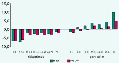 Hoewel de verwijscijfers naar elkaar toe lijken te kruipen, ligt het verwijscijfer van ziekenfondsverzekerden nog steeds fors hoger dan dat van particulier verzekerden. Vrouwen worden vaker verwezen dan mannen. Dit geldt ook voor particulier verzekerden. Figuur 2 geeft de gemiddelde groei of afname weer van het verwijscijfer sinds 1996, uitgesplitst naar leeftijd, verzekeringsvorm en geslacht. De daling van het verwijscijfer van ziekenfondsverzekerden treedt op bij zowel mannen als vrouwen en in alle leeftijdsgroepen, maar vooral bij de 0-14-jarigen. De verwijzingen van particulier verzekerden nemen juist toe, vooral bij de mannen.