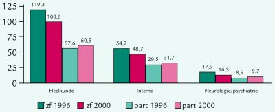 De daling van het aantal verwezen ziekenfondspatiënten deed zich voor bij alle specialismen, maar was het sterkst bij de heelkundige specialismen. Bij deze groep daalde het verwijscijfer van 119 per 1000 in 1996 tot 101 per 1000 ziekenfondsverzekerden in 2000. Het aantal verwijzingen naar neuroloog en psychiater daalde van 18 per 1000 in 1996 tot 16 per 1000 ziekenfondsverzekerden in 2000. Bij de groep interne specialismen (inwendige geneeskunde, maar ook longziekten, cardiologie, reumatologie, gastro-enterologie, pediatrie en dermatologie/allergologie) daalde het verwijscijfer van de ziekenfondsverzekerden van 55 per 1000 in 1996 naar 49 per 1000 in 2000. Ook de lichte stijging van het aantal verwijzingen bij particuliere patiënten deed zich bij alle specialismen voor. Het gaat dan om 1 à 2 verwijzingen meer in 2000 ten opzichte van 1996 ( figuur 3).