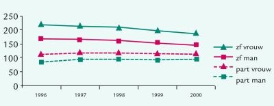 Het aantal nieuwe verwijzingen van ziekenfondsverzekerden naar de tweede lijn is net zoals in de jaren 1996 -1999 in 2000 opnieuw gedaald (zie figuur 1). In 2000 verwees de huisarts 169 per 1000 ziekenfondsverzekerden naar de tweede lijn. Sinds 1996 daalt het aantal verwijzingen van ziekenfondspatiënten met gemiddeld 3,6% per jaar. Het aantal particuliere verwijzingen daarentegen stijgt sinds 1996 met gemiddeld 1,6% per jaar; in 2000 verwees de huisarts 103 patiënten per 1000 particulier verzekerden.