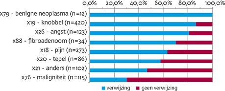 In totaal waren er gegevens over 1134 consulten beschikbaar voor analyse. Bij 352 vrouwen (28%) was er volgens de huisarts geen verwijzing voor nader onderzoek geïndiceerd. In de [figuur] staan de door de huisarts gestelde diagnoses bij verwezen en niet-verwezen vrouwen. Bij een knobbel/zwelling werd 87% verwezen. Er waren 12 vrouwen met een benigne neoplasma, die allemaal werden verwezen. Het verwijspercentage bij een (vermoeden van) maligniteit was 30%. Bij het merendeel van de vrouwen met deze diagnose was sprake van een bekende episode van borstkanker (89 van de 115). Bij 26 vrouwen met een nieuwe ziekte-episode van een mogelijke maligniteit werd 92% verwezen.