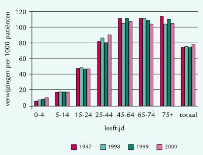 Het aantal door de huisarts naar de fysiotherapie verwezen patiënten is de laatste jaren redelijk stabiel: in 2000 waren dit 77 verwijzingen per 1000 patiënten (figuur 1). Ook de aantallen per leeftijdsgroep zijn tamelijk constant. Het zijn met name patiënten boven de 45 jaar die fysiotherapeutische behandeling behoeven. De enige leeftijdscategorie waar sprake lijkt te zijn van een gestage stijging in het aantal verwijzingen is die van 0-4 jaar, veelal vanwege ontwikkelingsstoornissen. Het lijkt niet aannemelijk dat de prevalentie hiervan in zo'n korte periode sterk is gestegen. Een verklaring zou kunnen liggen in een toename van het aantal kinderfysiotherapeuten, gecombineerd met een toegenomen bereidheid of geneigdheid om te verwijzen.