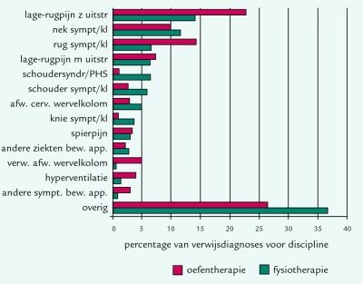 De disciplines vissen voor een deel van de patiënten ‘in dezelfde vijver’. Voor de meest voorkomende verwijsdiagnose, lage-rugpijn, geeft de NHG-Standaard ook geen directe voorkeur aan een van de disciplines: ‘de huisarts verwijst naar een hem bekende therapeut (…)’. Onderzoek bevestigt dat de bekendheid van de huisarts met de fysiotherapeut de belangrijkste reden is om naar de fysiotherapie te verwijzen. De inhoud van de behandeling lijkt van minder belang. Het aantal verwijzingen naar de fysiotherapeut is elfmaal zo groot als het aantal naar de oefentherapeuten Cesar en Mensendieck. Omdat de verhouding oefentherapie/ fysiotherapie in 1996 nog 1 op 22 was, lijkt het er echter op dat de oefentherapeuten langzaamaan terrein winnen. Het aantal verwijzingen naar de oefentherapie is harder gestegen dan op grond van de toename van het aantal therapeuten was te verwachten. Dus, óf de bekendheid van de huisarts met de oefentherapie neemt toe óf de geneigdheid naar deze discipline te verwijzen.