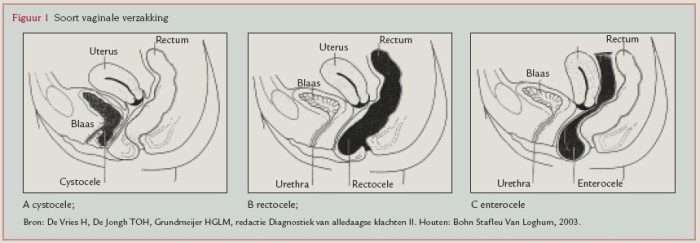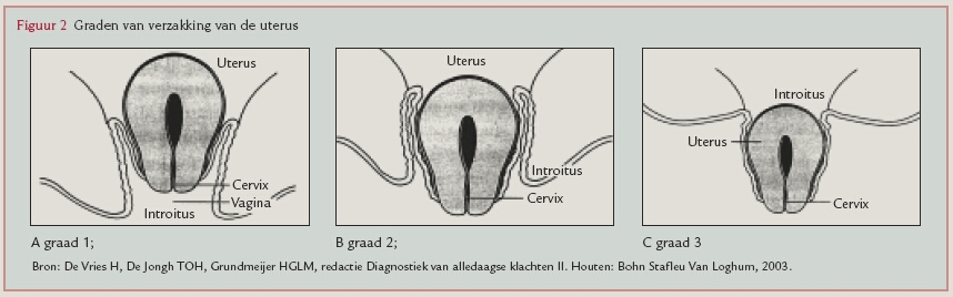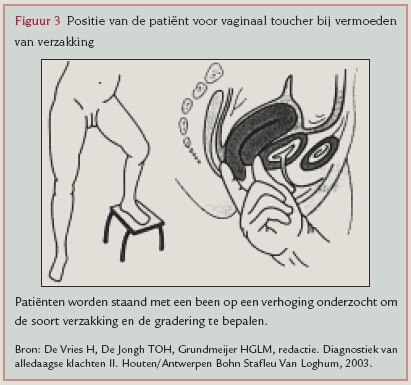Van der Waart ThHAM, Hendriks LEL, IJland MM. Verzakkingsgevoel. Huisarts Wet 2004;47(4):198-201. Een verzakking komt veel voor, vooral bij vrouwen ouder dan 45 jaar die kinderen hebben gekregen. Voor de meeste vrouwen is een verzakking geen reden om naar de huisarts te gaan omdat ze er geen of weinig last van hebben. De vrouwen die wel naar de huisarts gaan, willen duidelijkheid over de aard van de afwijking, en vinden het niet altijd in eerste instantie belangrijk dat er een behandeling wordt ingezet. Tijdens het afnemen van de anamnese is het belangrijk inzicht te krijgen in de aard en ernst van de klachten van de patiënte en de impact op het dagelijks functioneren. Op basis van anamnese en lichamelijk onderzoek, met name gynaecologisch onderzoek, kan men een onderscheid maken naar type en mate van verzakking.