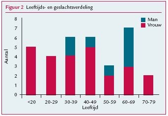 Zevenendertig patiënten namen aan het onderzoek deel. De gegevens van 33 patiënten, 26 vrouwen en 7 mannen met een gemiddelde leeftijd van 44 jaar waren beschikbaar voor analyse (tabel 1). De leeftijds- en geslachtsverdeling staat in figuur 2. De gemiddelde duur van de symptomen bij intake was 6 weken. Vier deelnemers hadden het raynaudfenomeen in de voorgeschiedenis. Eén deelnemer rookte en niemand gebruikte nicotinehoudende kauwgum of pleisters. Behalve bij 4 deelnemers die bètablokkers gebruikten, was er geen sprake van medicatiegebruik dat relevant was voor het onderzoek. Met uitzondering van bètablokkergebruik (alle gebruikers in de groep die met placebo startte) en het raynaudfenomeen (alle patiënten in de groep die direct met vitamine D3 startte) verschilden de verzamelde baselinegegevens van beide groepen niet van elkaar. De compliantie van de deelnemers was uitstekend. Alle patiënten vulden hun dagboek volledig in. Ze misten geen enkel face-to-face-contact. Ze namen de onderzoeksmedicatie consequent in: we telden maar 27 vergeten capsules (van de 1617 die de patiënten in totaal moesten innemen). Tabel 2 (‘klacht’) en tabel 3 (‘beperking’) laten de uitkomsten van het onderzoek zien. Achtendertig procent van de patiënten rapporteerde na drie weken placebogebruik een vermindering van ‘klacht’ en 10% meldde een vermindering van ‘beperking’. Na 4 weken vitamine D3-gebruik rapporteerde 33% van de deelnemers een vermindering van ‘klacht’ en 45% een vermindering van ‘beperking’. Na zeven weken vitamine D3-gebruik verschoof dat naar respectievelijk 47% (minder ‘klacht’) en 35% (minder ‘beperking’). Na correctie voor patiënten bij wie gedurende de interventieperiode sprake was van een oplopende temperatuurtrend rapporteerde 31% minder ‘klacht’ en 13% minder ‘beperking’ bij drie weken placebogebruik. Deze getallen daalden naar 18% (minder ‘klacht) en 6% (minder ‘beperking’) na 7 weken vitamine D3-gebruik. Na correctie voor patiënten met een oplopende temperatuurtrend in de interventieperiode of een neerwaartse trend in de baselinegegevens voor ‘klacht’ of ‘beperking’, dus na correctie voor mogelijke verbetering op grond van andere oorzaken dan het gebruik van vitamine D3, rapporteerde 19% minder ‘klacht en 6% minder ‘beperking’ na 3 weken placebo. Na 7 weken vitamine D3 waren de uitkomsten gelijk. Om een effect gemaskeerd door een geringe ernst van de klachten bij inclusie niet te missen hebben we apart gekeken naar de 10 deelnemers (31%) met de hoogste VAS-scores (‘klacht’ of ‘beperking’) in de baselineperiode. Voor deze groep vonden we geen afname van ‘klacht’ of ‘beperking’, niet na 3 weken placebogebruik, noch na 7 weken vitamine D3-gebruik. Intention to treat-analyse liet een vergelijkbaar resultaat zien.