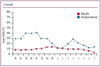 De onderzoekspopulatie bestond uit patiënten die langer dan drie weken klachten hadden van chronische perniones. Huisartsen in de regio Waterland (Noord-Holland) verwezen de patiënten tussen 1 november en 15 februari in de winter van 2003-2004 naar ons door. We bevestigden de diagnose na klinische beoordeling door een getrainde huisarts (IS). De kwaliteit van die beslissingen controleerden we door zijn beoordeling van dia’s met foto’s van de laesies en bijbehorende intakegegevens te vergelijken met de beoordeling van een dermatoloog. Beiden drukten de mate van waarschijnlijkheid van de diagnose chronische perniones uit op een vijfpuntsschaal. Voor 21 patiënten (64%) verschilde het oordeel niet. Voor 6 patiënten (18%) scoorde de dermatoloog de waarschijnlijkheid van de diagnose chronische perniones 1 categorie lager en bij nog eens 6 patiënten (18%) 1 categorie hoger dan de huisarts. Exclusiecriteria waren een inflammatoire aandoening in de voorgeschiedenis, hypercalciëmie, hyperparathyreoïdie, zwangerschap, borstvoeding, het gebruik van een calciumantagonist en onvermogen om een dagboek bij te houden. De onderzoeksopzet is gebaseerd op een tijdserieanalyse, waarbij we elke patiënt gedurende acht weken volgden en de patiënt zijn eigen controle was (figuur 1). Per patiënt bepaalden we of de toediening van vitamine D de ondervonden klachten en beperkingen deed verminderen. In feite hebben wij dus een serie identieke n = 1-onderzoeken verricht. Er zijn twee redenen voor de keuze van deze opzet. In de eerste plaats is er vrijwel niets bekend over de pathogenese van perniones. Het is weliswaar algemeen geaccepteerd dat blootstelling aan kou de klachten van chronische perniones beïnvloedt, maar over andere mogelijke confounders valt weinig te zeggen. Die confounders zijn er waarschijnlijk wel. Zo bestaat er vrijwel zeker een individuele gevoeligheid voor het krijgen van de aandoening. Omdat in onze opzet elke patiënt zijn eigen controle vormt, is de gevoeligheid van het onderzoek voor het effect van (onbekende) patiëntgerelateerde factoren minder dan bij een RCT van het parallelle type het geval zou zijn, zeker gezien de beperkte grootte van onze onderzoekspopulatie.13,14 In de tweede plaats is het mechanisme van het veronderstelde effect van vitamine D3 onbekend. Er valt dus niets zinnigs te zeggen over de duur van de noodzakelijke wash-outperiode en mogelijke patiëntgerelateerde factoren. Daarom is een cross-overonderzoek minder geschikt. Bij de intake verzamelden we gegevens over de mate van blootstelling van de deelnemers aan de buitenluchttemperatuur (kleedgewoonten, verwarming van de verschillende ruimten in huis en blootstelling door werk of hobby), comorbiditeit, rookgewoonten, nicotinegebruik op een andere wijze (kauwgum of pleisters) en medicatiegebruik. In de eerste week van het onderzoek gebruikten de patiënten geen medicatie en verzamelden we baselinegegevens over ondervonden pijn, jeuk en beperkingen bij het dagelijks functioneren. We randomiseerden de medicatie in de volgende drie weken (vitamine D3 of placebo). Gedurende de laatste vier weken gebruikten alle patiënten vitamine D3 (figuur 1). Gedurende de gehele periode van acht weken hielden de patiënten een dagboek bij over de ondervonden klachten en beperkingen. Aan het einde van week 1, week 4 en week 8 was er persoonlijk contact met de patiënten. We controleerden de dagboeken op volledigheid. De correcte inname van de onderzoeksmedicatie verifieerden we door het tellen van de vergeten capsules. Een onafhankelijk laboratorium controleerde de samenstelling van de actieve medicatie. Het vitamine D3-gehalte varieerde per capsule tussen 91,3% en 107,6% van het afgesproken gehalte. Dit is volgens de hiervoor in Nederland geldende regels acceptabel. Voor de randomisatie van de medicatie in de tweede periode, die bedoeld was om voor elke individuele patiënt het moment te maskeren dat deze met de toediening van vitamine D3 startte, maakten we gebruik van blokrandomisatie, met een blokgrootte van tien.15 De apotheker die de onderzoeksmedicatie samenstelde, verrichtte de randomisatie, blind voor patiënt en onderzoeker. De vitamine D3-houdende capsules waren niet te onderscheiden van die met placebo. Uitkomstmaat was de verandering in de ernst van de klachten zoals de patiënt die uitdrukte op een 100 mm visueel analoge schaal (VAS). Er waren drie schalen: een voor jeuk, een voor pijn en een voor de ondervonden beperkingen. We hielden de gemiddelde dagtemperatuur voor elke onderzoeksdag van iedere individuele patiënt apart bij. Daarvoor gebruikten we gegevens van het Koninklijk Meteorologisch Instituut (KNMI). Omdat de meeste patiënten hun klachten bleken te beschrijven als jeuk of pijn hebben wij ‘klacht’ gedefinieerd als jeuk of pijn, afhankelijk van de hoogste gemiddelde VAS-score in de baselineperiode. ‘Beperking’ definieerden we als de ondervonden beperkingen in het dagelijkse leven zoals door de patiënt vastgelegd op de VAS. De vergelijkbaarheid van de twee groepen patiënten (de groep die eerst startte met placebo en de groep die direct vitamine D3 kreeg) controleerden we door te proberen aan de hand van de verzamelde intake- en baselinegegevens verschillen tussen de beide groepen aan te tonen. We gebruikten een chi-kwadraattoets met α = 0,05 om verschillen aan te tonen voor leeftijds- en geslachtsverdeling, comorbiditeit, de verschillende factoren die te maken hebben met de mate van blootstelling aan de buitenluchttemperatuur, rookgewoonten, nicotinegebruik anderszins en medicatiegebruik. Een t-test met α = 0,05 moest mogelijke verschillen aantonen met betrekking tot de duur van de klachten bij inclusie en de baselinescores voor ‘klacht’ en ‘beperking’. Om de veranderingen in de VAS-scores te evalueren, hanteerden we een tijdserieanalysemethode. We beoordeelden de gegevens per patiënt afzonderlijk. Dezelfde methode gebruikten we om de temperatuursveranderingen te evalueren voor elke 