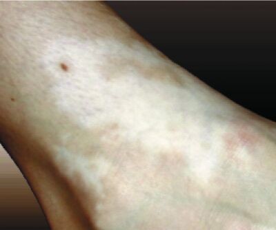 Vitiligo is een benigne, verworven huidaandoening die geleidelijk progressief is. Deze aandoening kenmerkt zich door circumscripte hypomelanotische plekken. 3 De melanocyten in de dermis verdwijnen, waardoor huid en haar hun pigment verliezen. Melkwitte, onregelmatige, scherp begrensde plekken van verschillende grootte ontstaan met vaak een gehyperpigmenteerde rand. Voorkeurslokalisaties zijn: het gezicht, de handen en voeten, drukplaatsen, rond de lichaamsopeningen en lichaamsplooien bij de geslachtsorganen. Vitiligo kan gegeneraliseerd voorkomen of zich meer beperken tot een lokale vorm. Spontane repigmentatie komt voor, maar het herstel is meestal onvolledig en cosmetisch niet fraai.