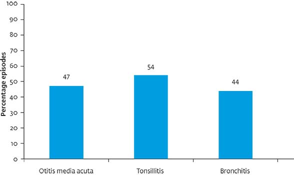 Huisartsen zijn niet terughoudend in het voorschrijven van antibiotica aan kinderen met oor- en luchtweginfecties. In ongeveer de helft van de gevallen krijgt een kind een antibioticum; het vaakst bij tonsillitis (54% van de episodes) en het minst vaak bij bronchitis (44%) [figuur].